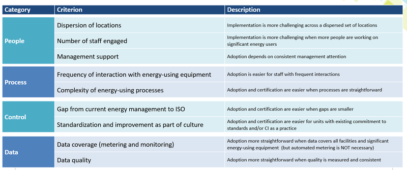 Specifies requirements for establishing, implementing, maintaining and improving an energy management system, whose purpose is to enable an organization to follow a systematic approach in achieving continual improvement of energy performance, including energy efficiency, energy use and consumption. (https://www.iso.org/standard/51297.html)