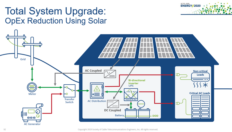 SCTE’s Adaptive Power Systems Interface Specification (APSIS) is an end-to-end energy control system across the broadband network. It manages specific pieces of equipment, such as routers, switchers, and CMTSs, but also provides energy monitoring and control systems. One area of focus for APSIS would be to power down equipment, such as a router, set-top box or power plant, when it’s not in use. Depending on the conditions, the equipment could be put into “rest and sleep” mode instead of running at full power during non-peak times.
